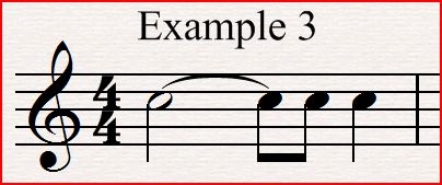 Example 3 shows how a tie may be used to create a note of any length. It is not possible to write a single note of two and a half beats but this example shows how useful a tie can be.